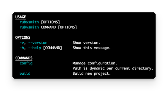All build options only accept booleans values and can be customized as desired. When changing your build options, they will dynamically render when displaying usage (i.e. rubysmith --help). All of these options have been explained in greater detail in the Usage section.