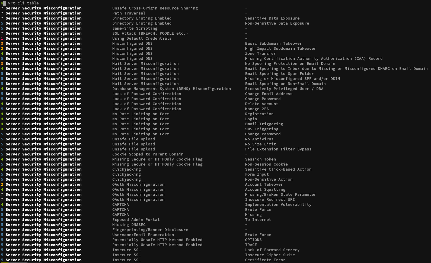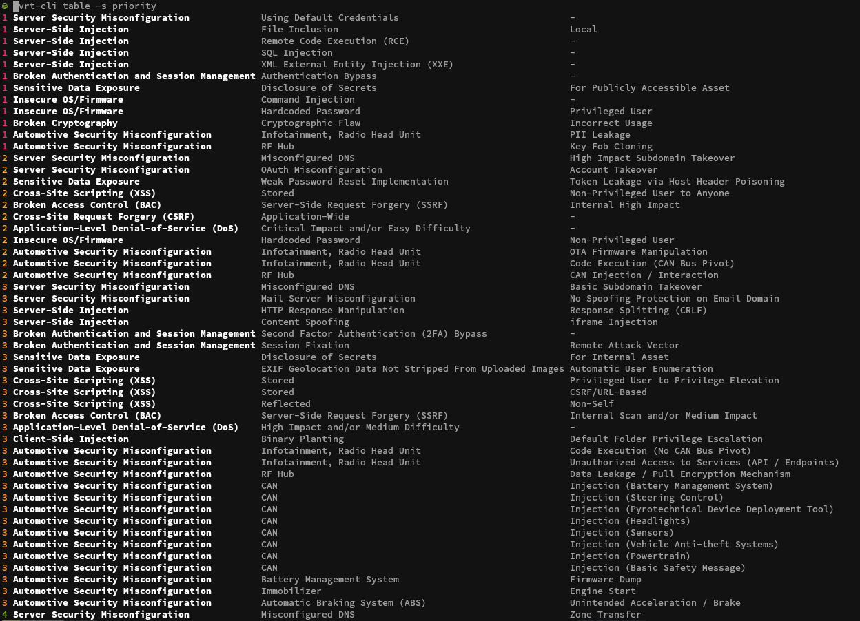 A simple tool to visualize VRT (Vulnerability Rating Taxonomy) from the CLI. This gem is unofficial and is maintained by noraj not by Bugcrowd.